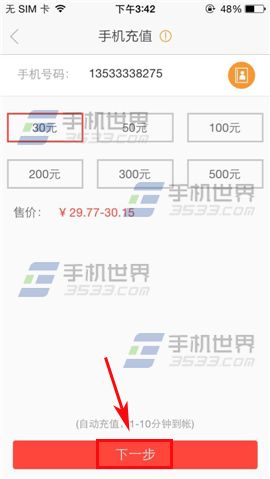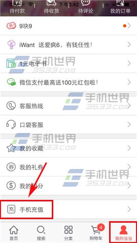 1)首先打开手机当当,点击【我的当当】,在界面往下拉点击【手机充值】,进入界面输入充值的手机号码和选择充值金额,点击【下一步】。(如下图)