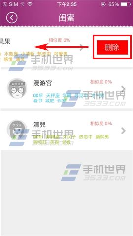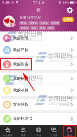 1)首先打开女生秘密,点击【我的】,然后点击【我的闺蜜】,进入界面选择要删除的好友向左划,弹出窗口点击【删除】即可删除闺蜜。(如下图)