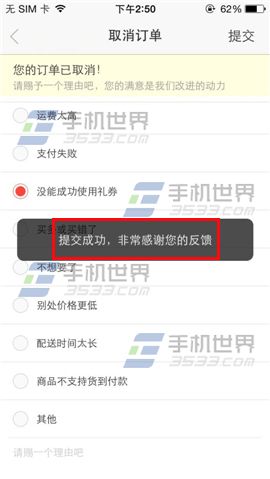 2)弹出窗口点击【取消订单】,在界面选择取消订单的原因点击一个,点击【提交】。(如下图)