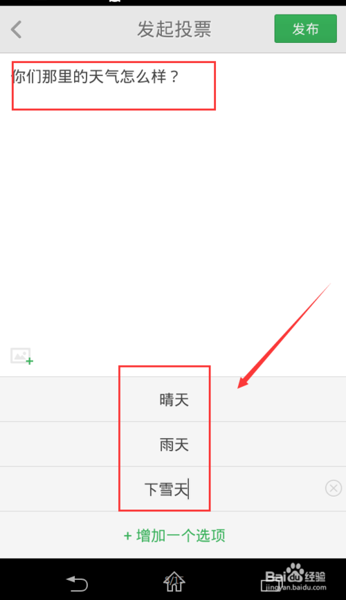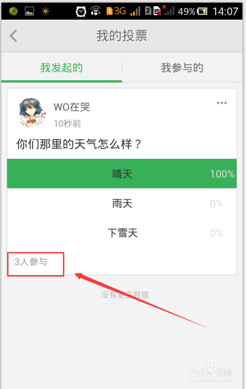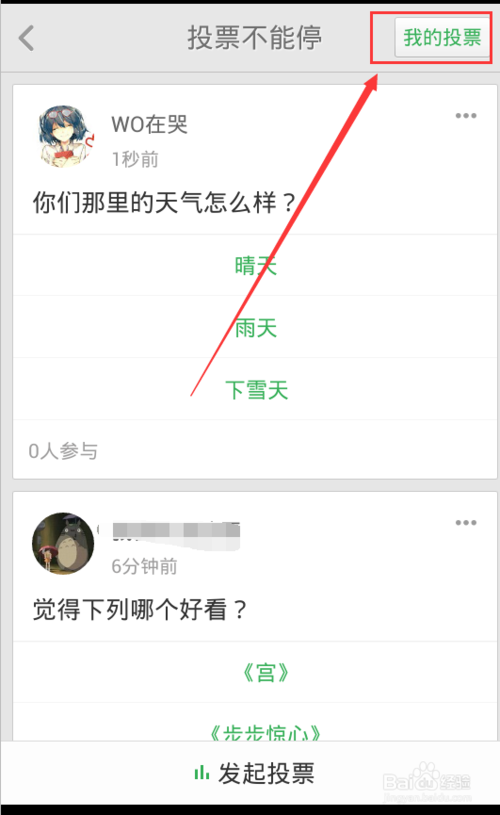 2、找到发起投票,点开,比说小编在这里面发起了一个投票,这里可以填你想要投票的话题