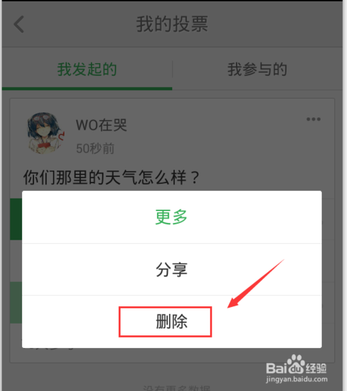 2、然后会出来两个选项,一个分享,一个删除,可以分享自己的投票到朋友圈,也可以删除自己的发起的投票