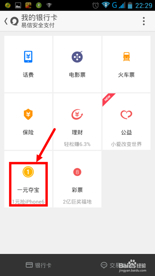 1、在参与一元夺宝是首先是要帮定你的网银,这样你才有钱支付。首先打开易信选择”我“选项,然后点击”我的银行卡“。