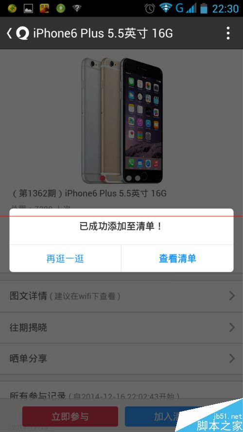3、在夺宝页面中选择你喜欢的物品,点击进入,进入后可以选择立即参与或加入清单。