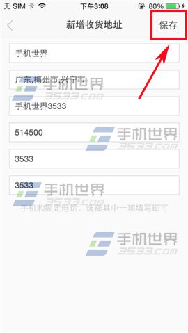 2)进入界面输入收货人、详细地址和手机号码,点击【保存】即可添加成功。(如下图)