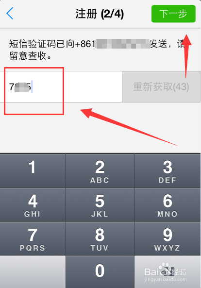 4、再输入手机收到的验证码,然后点击【下一步】按钮,如下图所示。
