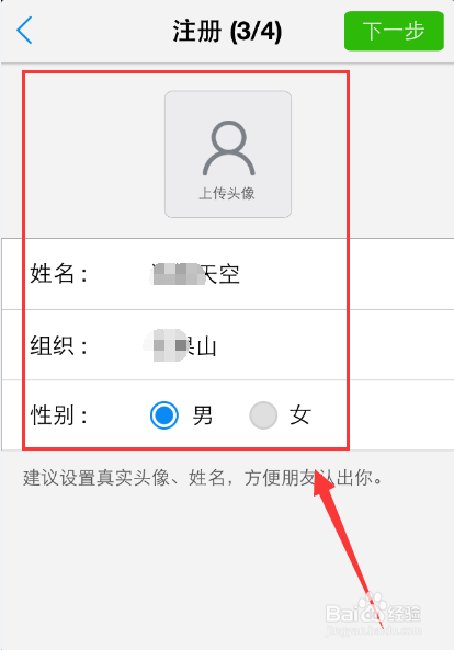 5、在进入的页面,输入相关注册信息和上传头像,再点击【下一步】按钮,如下图所示。