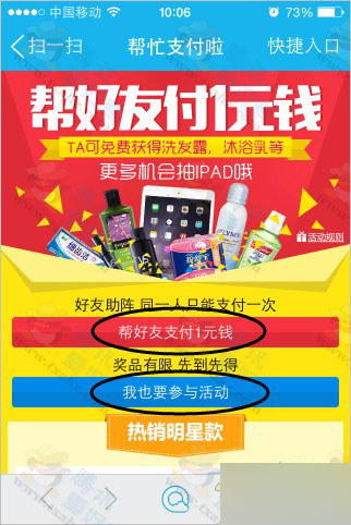 2、进入活动点击“我也要参加活动”(如果是你的小号或朋友打开你的链接就点击“帮好友支付1元”)如下图: