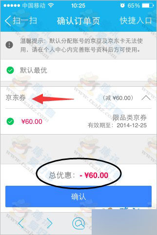3、邀请完成后点击“领取奖品”,然后去购物,满60元便可。结算的时候选择用“京东券”。如下图: