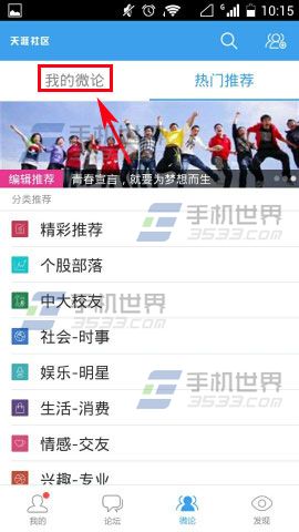 1)首先先打开【天涯社区】,进去之后点击【微论】,接着点击【我的微论】。(如下图)