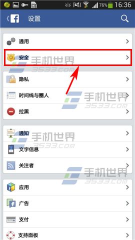 1)打开手机Facebook,选择【三】栏,点击【账户设置】,然后选择【安全】选项。(如下图)