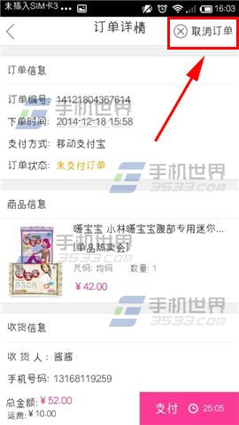 2)点击【待支付】,点击订单详情里右上方的【取消订单】就可以啦。(如下图)