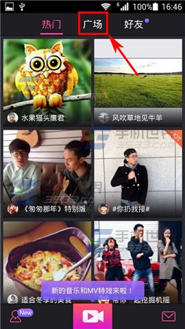 1)打开美拍,点击【广场】,然后点击【搜索】。(如下图)