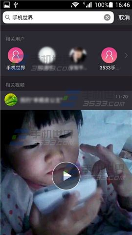 2)输入关键字,点击输入框下方的【搜索】,就可以搜索到相关的视频和用户了。(如下图)