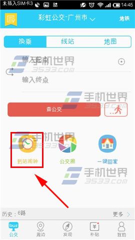 1)打开【彩虹公交】,点击到站闹钟。(如下图)