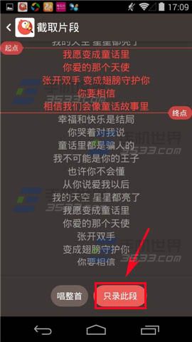 2)在界面选择歌曲,点击【留声】,在界面可以唱整首或截取片段,小编与截取片段为例哦,点击【只录此段】即可开始录制歌曲。