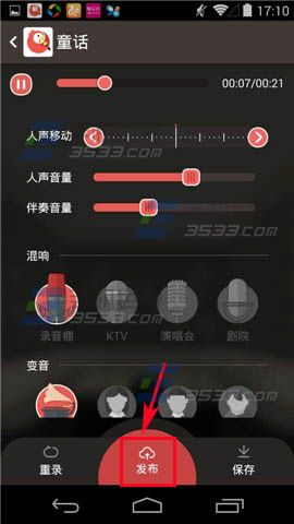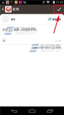 3)录制歌曲之后便会自动跳转,在界面可以修改混响、变音等等,点击【发布】,如果用户想要匿名发表可以点击【匿名发表】,最后点击【√】。