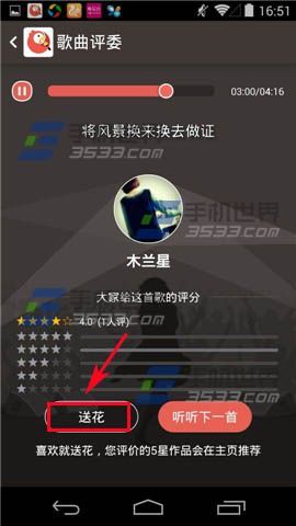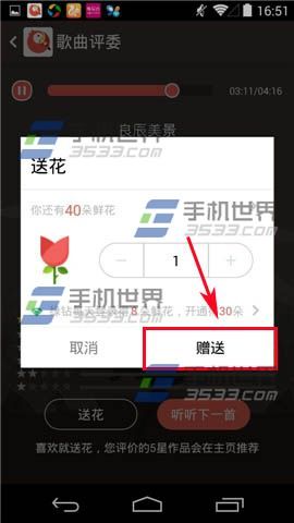 2)如果用户觉得好听还可以送花哦,点击【送花】,弹出窗口点击【赠送】即可。