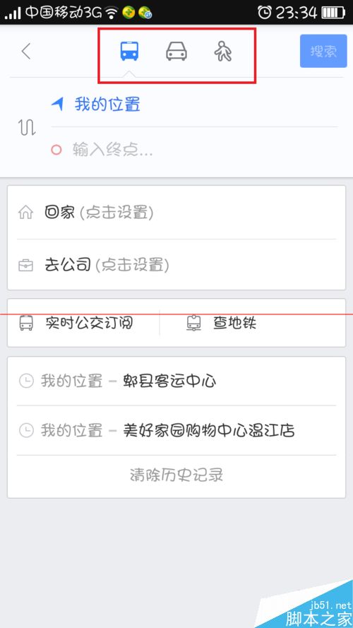 4、然后在页面上选择路线方式,可以查询公交、走路、自驾三种方式。我们以选择公交路线为例。然后在终点处输入你的目的地,出发地一般都是以你所在位置为默认,当然也是可以设置的哦。