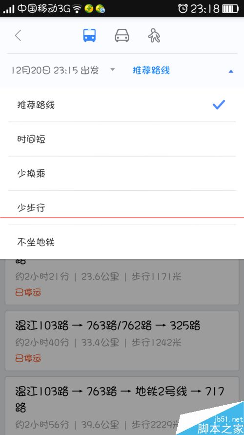 6、将出发地与终点设置完毕后,点击【查询】然后系统就会自动搜索乘车路线,系统会提示使用时间最短的路线,然后我们还可以通过设置来查询其他条件的路线,如少换车、少步行等等条件。