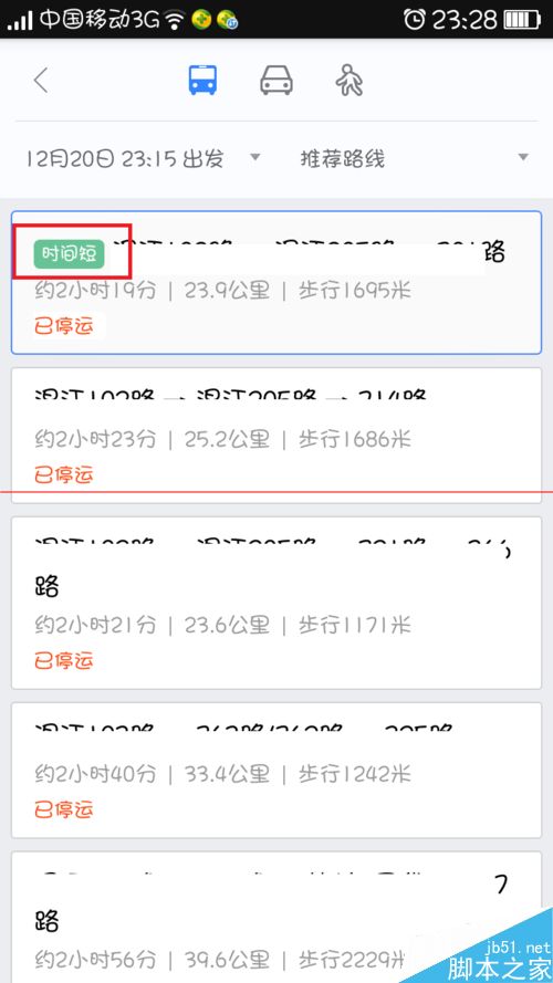 7、然后选择你认为最适合你的乘车路线,点击就可以查看在地图上的详情哦。如下图所示