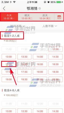 2)在界面点击【预订】,进入界面选择日期、人数、点击需要预订的时间。(如下图)