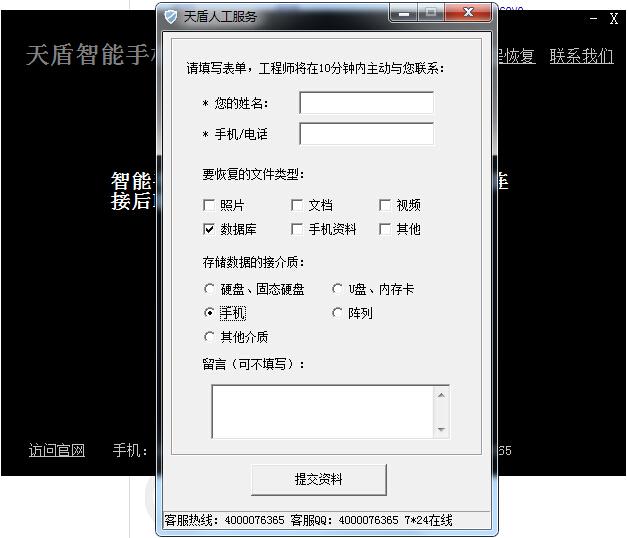 第六步:填写提交人工服务表单,天盾数据恢复中心的工程师会尽快跟用户联系,为用户解决手机数据丢失问题。