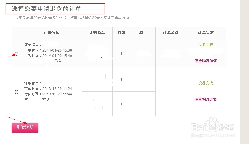 点击“开始新的退货”--“开始退货”---选定要退货的项目