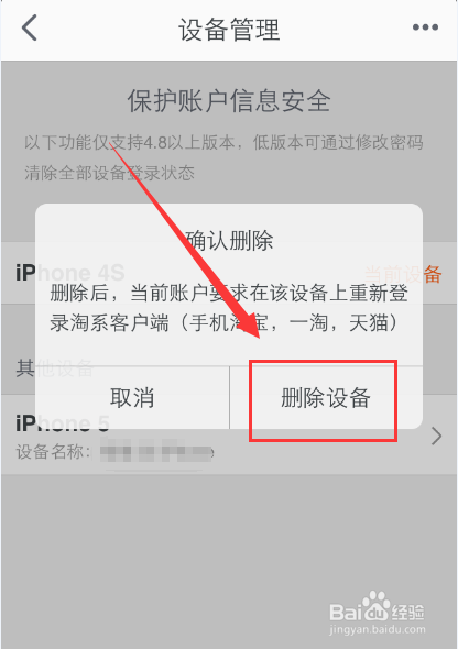 7、然后在弹出的窗口,点击【删除设备】就可以了,这样账号在其它设备上就被强制下线了。
