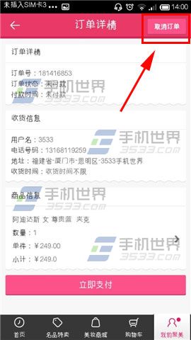2)点击【未付款】,选择那个你需要取消的订单,点击进去后的订单详情右上角有【取消订单】的按钮,点击它就可以啦。(如下图)