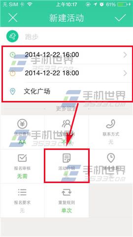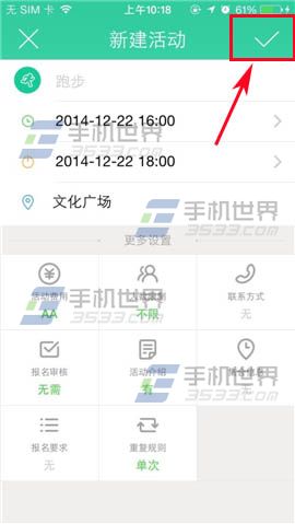2)在界面填写活动开始时间和结束时间,详细地址,在下方还可以设置活动费用、人数限制、联系方式等等,小编就已设置活动介绍为例。点击【活动介绍】,在方框输入活动细节等等,点击【√】。(如下图)