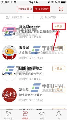 1)首先打开淘小店,点击【品牌店】,在界面点击【更多品牌店】,在界面选择要添加关注的品牌,点击【关注】即可添加关注。(如下图)