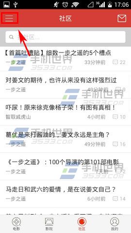 1)首先打开猫眼电影,点击【社区】,然后在左上方点击【三横】。(如下图)