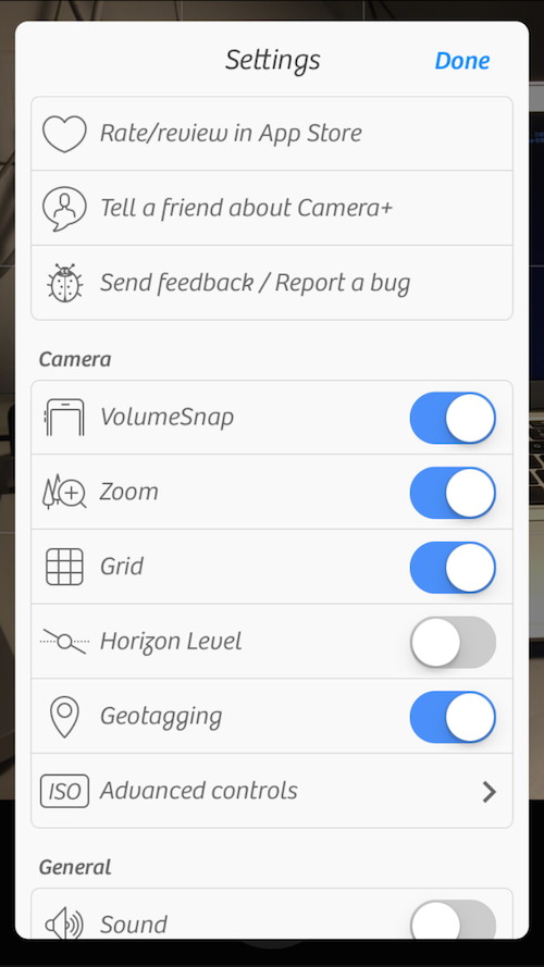 有专门针对处女座的「水平仪」,有强迫症的人,在水平仪不是保持完全水平的状态的情况下是绝对不会拍照的,还有一些和原生相机很像的功能,比如说那几条辅助的线之类的,在这里它叫 Grid,和原生相机里的「九宫格」样子的辅助线长的是一样的,方便取景的时候更好的摆放景象在取景器中的位置,这个功能可以用来给新手练手,也可以给专业的摄影人士在需要构图结构的时候用,当然也不要忘了处女座们。