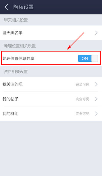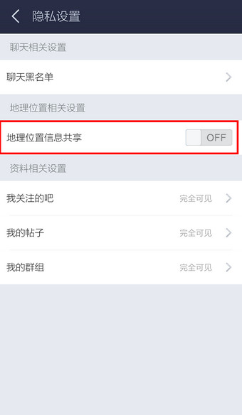 点击【地理位置信息共享】滑块选择关闭即可