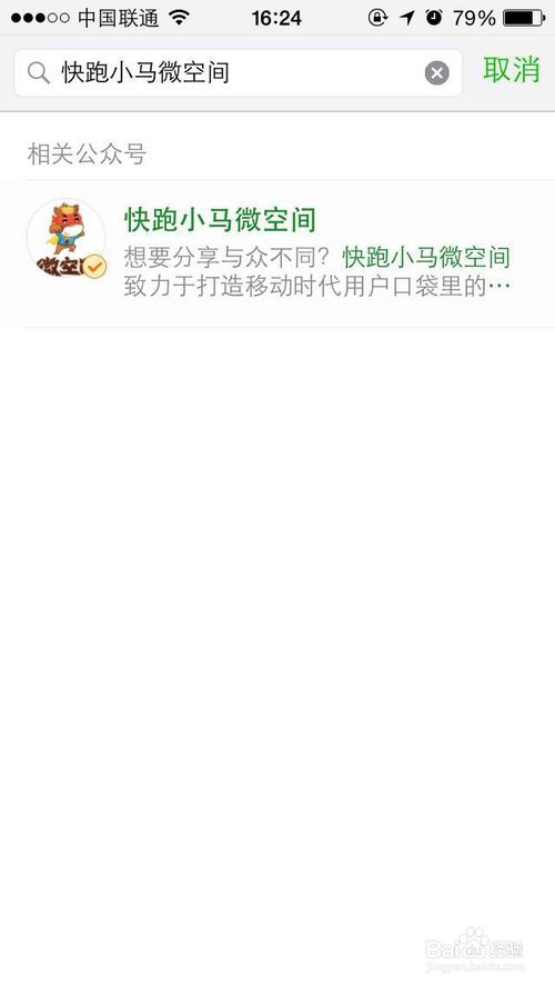 1、打开微信,点击公众帐号,打开“+”,搜索“快跑小马微空间”