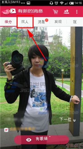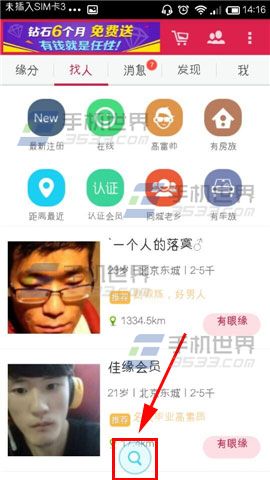 1)打开【世纪佳缘】app,点击导航栏的【找人】。(如下图)