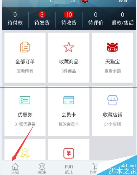 1、我们登陆天猫账号之后,点击屏幕左下角的“天猫”,如图示。