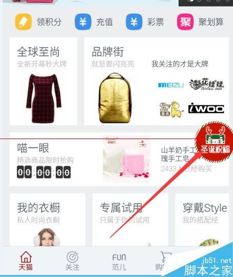 圣诞节马上就要到了,昨天在逛手机天猫的时候,发现天猫有一个圣诞祝福的活动,于是点进入看了一下,感觉还是比较好玩的。下面就向大家分享一下,天猫“圣诞祝福”怎么玩。