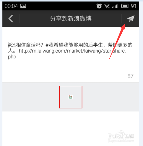 7、选择之后,会生成如图示文字,我们点击右上角的小飞机,分享到微博。