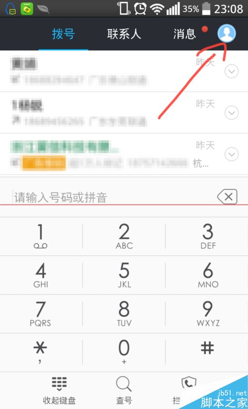 4、拨号界面、联系人、消息(短信)无非是想替代手机自带的打电话软件和通讯录。点击右上角那个头像。