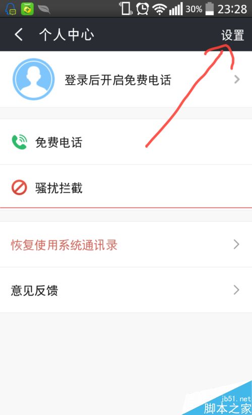 5、进入个人中心,因为没有申请到内测资格,所以这里是无法开启免费电话的。点击若上角的“设置”。