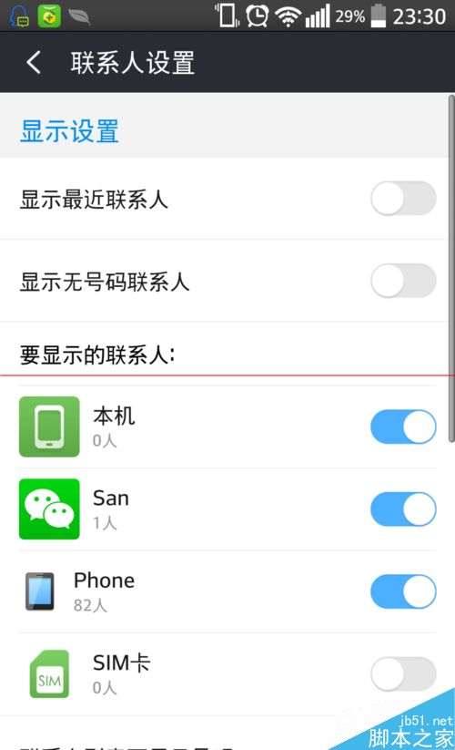 8、进入“联系人设置”,这里除了正常见过的功能外,比较有特色的是可以选择显示不同来源的联系人,如本机、微信、手机、SIM卡。
