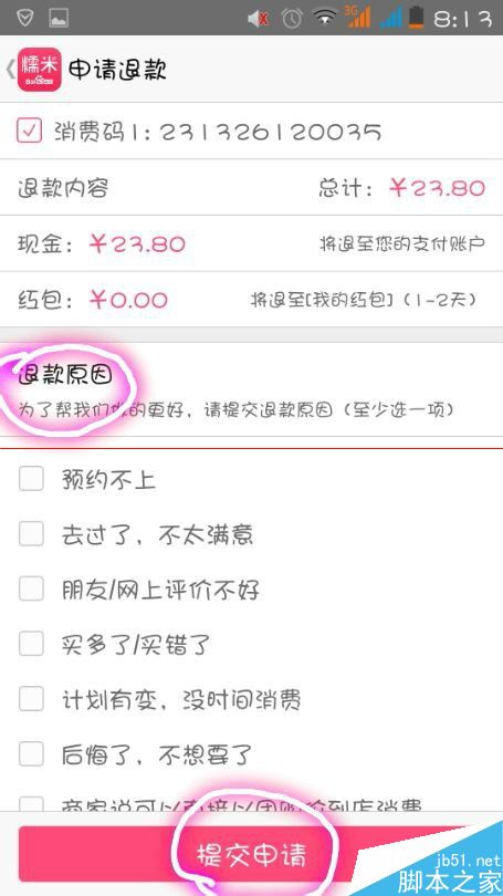 4、选择退款原因,提交申请。