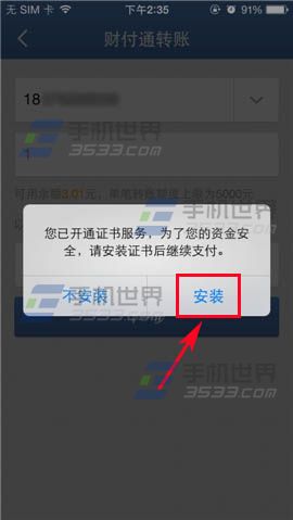 2)在界面输入收款人账号,转账金额和姓名,点击【下一步】,这时用户要是开通了证书服务,就要先安装证书才能使用,点击【安装】。(如下图)