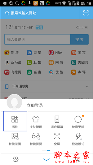 2、点击UC浏览器底部导航栏的中间三个横杠图标,弹出的小页面中选择“插件”如下图所示: