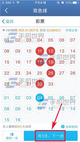 2)进入界面选择要购买彩票的类型(例:双色球),在界面用户可以直接自选号码,也可以随机一注,然后点击【下一步】。(如下图)