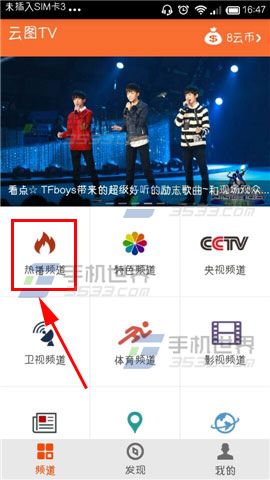 1)打开【云图TV电视直播】,小编给大家先示范下,点击【热门频道】。(如下图)