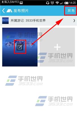 3)点击上方的【+】按钮去添加照片,添加的照片中间有个图标,点击它可以给照片描述文字,编辑完后就点击【发布】吧。(如下图)