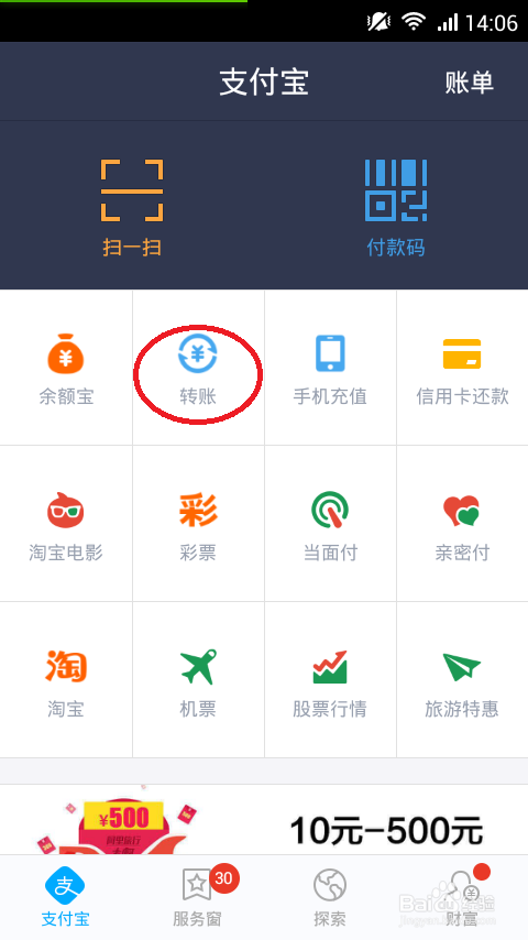 登陆支付宝,进入主界面,点击红圈中的转账。