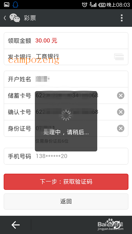 正确填写你的银行卡号,姓名,身份证后6位数,然后点获取验证码,如下图